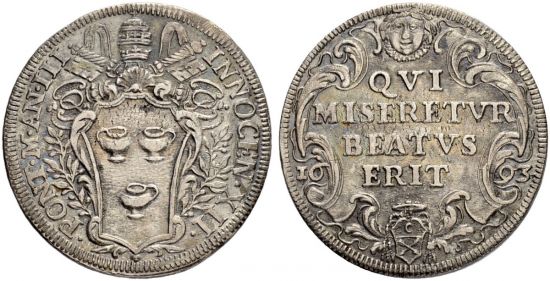 "Kirchenstaat, Innozenz XII. 1691-1700. Testone 1693, Rom. Sehr schön-vorzüglich. (Papal States, Innocent XII, 1691-1700, testone of 1693, Rome mint. Very fine-extremely fine.)"