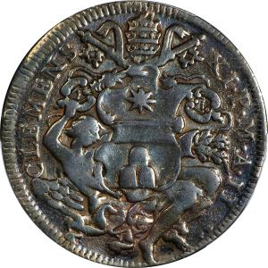 This specimen was lot 56812 in Stack's Bowers ANA sale (Pittsburgh, PA, August 2023), where it sold for $100. The catalog description[1] noted, "ITALY. Papal States. 1/2 Piastra, 1702 Year II. Clement XI. PCGS Genuine--Repaired, Fine Details. From an Old Brooklyn Collection." The mezza piastra was 52½ baiocchi, while the piastra, the Italian equivalent of the German thaler, was 105 baiocchi (3½ testone). The denomination was last minted in 1742 and superseded by the mezzo scudo in 1753. Wikipedia comments,