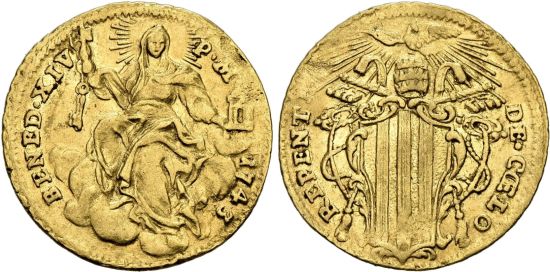 "ITALIEN Vatikan - Kirchenstaat, Benedikt XIV. 1740-1758. Zecchino 1743, Roma. Sehr schön. Leichte Fassungsspuren. (Italy, the Papal States, Benedict XIV, 1740-50, zecchino of 1743, Rome mint. Very Fine, Some traces of jewelry.)"