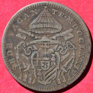 This type was minted 1774 only prior to the election of the new pope Pius VI. The doppio giulio was twenty baiocchi, while the scudo was one hundred baiocchi. The third specimen was lot 1610 in Künker sale 403 (Osnabrück, March 2024), where it sold for €1,300 (about US$1,706 including buyer's fees). The catalog description[1] noted,
