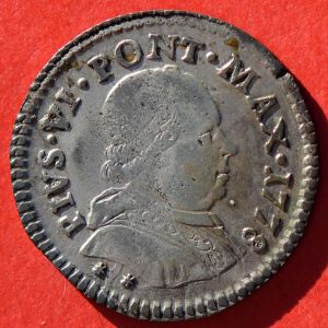 This type was issued 1778-96 for Pius VI (1774-99) from the Bologna mint. At Bologna, 80 bolognini = one scudo instead of one hundred baiocchi as in Rome. Therefore four bolognini = five baiocchi = one grosso. This type is not listed as expensive.