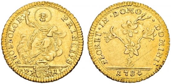 "Kirchenstaat, Pius VI. 1775-1799. 1/2 Doppia 1784, Roma. Sehr schön-vorzüglich. (Papal States, Pius VI, 1775-99, half doppia of 1784, Rome mint. Very fine-extremely fine.)"