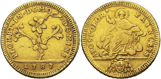 "ITALIE, ETATS PONTIFICAUX, Pie VI (1775-1799), (Giovanni Angelo Braschi), AV doppia romana, 1787, Rome. D/ FLORET IN DOMO DOMINI Plant de lis. R/ APOSTOLOR PRINCEPS Saint Pierre trônant de f. sur une nuée. Beau à Très Beau. (Italy, Pontifical State, Pius VI (1775-99), gold doppia romana of thirty paoli, 1787, Rome mint. Obverse: lily plant; reverse: St. Peter enthroned on a cloud. Fine to very fine.)"