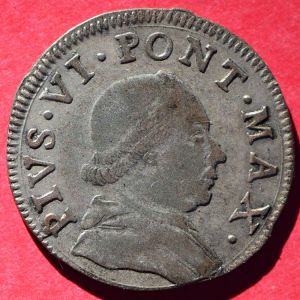 This type was issued 1778-96 for Pius VI (1774-99) from the Bologna mint. At Bologna, 80 bolognini = one scudo instead of one hundred baiocchi as in Rome. Therefore four bolognini = five baiocchi = one grosso. This type is not listed as expensive.