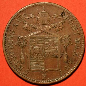 This type is listed for 1835-45 and was struck in Rome and Bologna (shown here). It is among the common Papal copper coins of the nineteenth century; the SCWC does not award any date a premium. The early coinage of the Papal States used an antique monetary system. After 1830, five quattrini = one baiocco; 100 baiocchi = one scudo. In 1866, the currency was reformed to use centesimi and lire in order to match that of the surrounding kingdom of Italy. In 1870, the Papal States were occupied and annexed by the kingdom of Italy and coinage ceased until 1929.