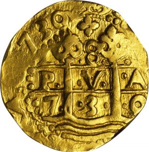 This specimen was lot 21444 in Stack's Bowers ANA sale (Philadelphia, August 2018), where it did not sell. The catalog description[1] noted, "PERU. 8 Escudos, 1730. Philip V (1700-46). NGC AU-58. Struck on a broad flan with even yellow gold color and surfaces that are without major instances of contact. As is common for these hammered issues, several areas of softness are observed in the strike, however two legible dates are visible, the first above the waves and divided by the pillars of Hercules, while the second (rarely seen) appears between 10 and 11 o'clock at the legend. Close inspection of both confirms this piece as an overdate as well (likely 30/29), with remnants of a '2' visible beneath the '3' on both dates and what appears to be the base of a '9' below the first date's '0'. Sure to draw significant specialist attention as such." This type is recorded for 1710-47. The Mexico City mint was converted to milled coinage in 1732-34 but Lima would not follow suit until 1751.
