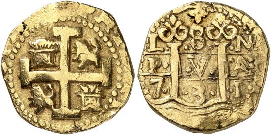 "Felipe V. 1700-1746. 8 Escudos 1731, LN-Lima. Cob type. 27.16 g. Cayon 10019. Selten und gut ausgeprägt. Leichte Fassungsspuren. Gutes sehr schön. (Peru, Philip V, 1700-46, eight escudos of 1731, Lima mint, cob type. Rare and well struck, Small traces of mounting, Good very fine.)"