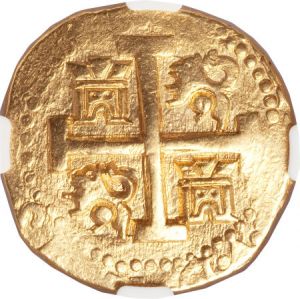 This specimen was lot 21654 in Heritage sale 3010 (Boston, August 2010), where it sold for $13,800. The catalog description[1] noted, "Felipe V gold cob 8 Escudos 1733N Lima, MS62 NGC 1733 Fleet, a superb example of this fascinating treasure with bold date and mint and glowing mint brilliance. An exceptional piece! From the Don Benito Collection of Hispanic Gold." This type is recorded for 1710-47. The Mexico City mint was converted to milled coinage in 1732-34 but Lima would not follow suit until 1751.
