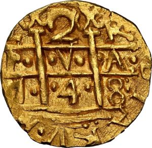 This specimen was lot 46 in Sedwick Auction 37 (Winter Park, FL, May 2025), where it sold for $39,000. The catalog description[1] noted, "PERU, Lima, gold cob 2 escudos, 1748 R, very rare, NGC MS 65, finest and only example in NGC census, ex-Caballero, ex-Almenara. Lustrous and very deeply struck with sharp details that lack any flattening or wear at all (hence the grade, far beyond any Ferdinand VI cob 2 escudos on record), the choice full pillars-and-waves well centered and the equally choice full cross-lions-castles just enough off-center to allow a visible FERDIN- of the king's name in the legend, traces of toning here and there. Pedigreed to the Caballero de las Yndias Collection (Aureo & Calicó auction of April 2009, lot 584) and to the ANE auction of March 1975 (lot 585), also pedigreed to the Almenara Collection (both stated on label)." This type was struck 1747-49 only. All dates are rare.