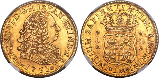 This specimen was lot 24842 in Heritage sale 3016 (Orlando, FL, January 2012), where it sold for $14,950. The catalog description[1] noted, "Ferdinand VI gold 4 Escudos 1751 LM-J, AU55 NGC. Very light circulation with greatly appealing, problem-free fields. An excessively rare denomination of this Ferdinand VI bust type and the first one we have offered." It was sold again as lot 32318 in Heritage sale 3041 (Chicago, August 2015) for $10,575. The type was struck in Lima, Peru, 1751-55. It is much scarcer from Peru than from the Colombian mints. Assayer JM is recorded for 1751-72.