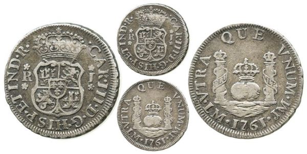 This specimen was lot 1589 in Sedwick sale 12 (Winter Park, FL, October 2012), where it sold for $200.60. The catalog description[1] noted, "Lima, Peru, pillar 1 real, Charles III, 1761JM. Nicely toned AXF with some dark sediment in crevices, no problems." This type was struck 1760-1772 for king Carlos III. As a class, pillar coinage of Peru is much less plentiful than that of Mexico, though it is more available than the remaining mints.