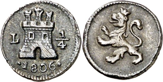 "1806. Carlos IV. Lima. 1/4 de real. Golpecitos. Rara. MBC/MBC+. (Peru, Charles IV, quarter real of 1806, Lima mint. Nicked, rare, very fine or better.)"
