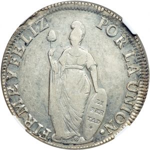 This specimen was lot 6058 in Goldberg sale 72 (Los Angeles, February 2013), where it sold for $115. The catalog description[1] noted, "Peru. 8 Reales, 1832-MM (Lima). Republic. Standing liberty. Lustrous. NGC graded AU-50. The Victor Jaramillo Collection." This type was struck at Lima and Cuzco 1830-36 and is rather common; the complete span of Peru standing liberty eight reales runs 1825-55. Assayer MM is recorded for 1831-35.
