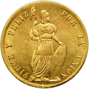 This specimen was lot 2763 in Goldberg sale 53 (Beverly Hills, May 2009), where it sold for $1,250. The catalog description[1] noted, "Peru. 4 Escudos, 1854-MB (Lima). Liberty standing holding shield and pole. Reverse: Arms. Lustrous and scarce in grade. NGC graded MS-61." This type was struck in Lima 1828 and 1850-55 only and is the scarcest gold denomination for Peru. There is no mention of Cuzco or Arequipa striking this type.
