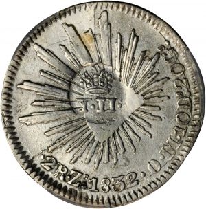 The first specimen was lot 1388 in Stacks-Bowers NYINC sale (New York, January 2015), where it sold for $1,175. The catalog description[1] noted, "PHILIPPINES. 2 Reales, ND (Decree of December 14, 1835, suppressed March 31, 1837 (By Decree of February 1, 1836). Type VI countermark crowned Y.II. within circle. On an 1832-ZsOM Mexico 2 Reales. VERY RARE host coin. Countermark well struck and slightly off center. Holed and plugged at 1 o'clock on the obverse, cleaned. Moderately worn. Countermark AU Details, host coin PCGS Genuine--Damage, VF details Secure Holder." This specimen was lot 21320 in Stack's Bowers ANA sale (Anaheim, CA, August 2016), where it sold for $3,760. The catalog description[2] noted, "PHILIPPINES. 2 Reales, ND (Decree of December 14, 1835, Suppressed March 31, 1837 (By Decree of February 1, 1836)). NGC VF Details--Excessive Surface Hairlines. RARE denomination. Clear countermark over a Guanajuato (Mexico) 1832-MJ 2 Reales. Lightly cleaned but still a terrific example of this SCARCE host coin and countermark combination. Ex: Gibbs Collection." This counterstamp was applied 1834-37 to Latin American pesos arriving in Manila from the newly independent republics, none of which were recognized by Spain. The SCWC lists over forty different types receiving this counterstamp. Counterstamped minor coinage is rare.