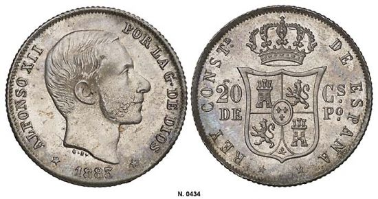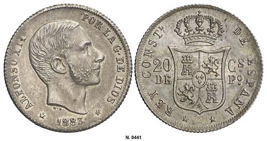 "Alfonso XII (1874-1885). 1883. Manila. 20 centavos. Bella. Muy rara así. EBC/EBC+. (Twenty centavos of 1883, Manila mint, nice, rare thus, extremely fine.)"
