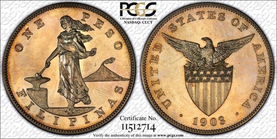 This type was struck in Philadelphia and San Francisco for the Philippine islands 1903-06. A smaller peso of lower fineness was struck in San Francisco 1907-12 (KM 172), after which no silver pesos were struck until the commemorative issues of 1936 (KM 177 and 178). Large size proofs are fairly available, especially for 1903 and 1904; small size proofs exist but are rare. These coins are listed in the Red Book as well as the SCWC and are collected as part of the United States series. The third specimen was lot 3030 in Goldberg sale 34 (Beverly Hills, February 2006). The catalog description[1] noted, "Philippines. Peso, 1903. Toned. PCGS graded Proof 62. Provenance: Purchased private treaty from Zander, $15.00."