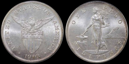 The fourth specimen was lot 3555 in Goldberg sale 32 (Beverly Hills, September 2005), where it sold for $170. The catalog description noted, "Philippines. Peso, 1903. This is the first year proofs were struck at the Philadelphia mint for the Philippines and a total of 2,558 were coined. Although ANACS has net graded this coin, we feel the toning is natural and is deserving of a higher grade. ANACS graded Net graded Proof 58 cleaned."