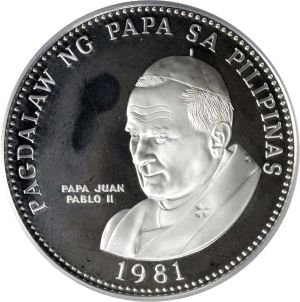 This specimen was lot 75225 in Stack's Bowers Collector's Choice sale (Costa Mesa, CA, February 2022), where it sold for $336. The catalog description[1] noted, "PHILIPPINES. 50 Piso, 1981-FM. Franklin Mint. PCGS PROOF-68 Deep Cameo. Celebrating the Papal Visit to the Philippines. A charming piece that celebrates the visit of John Paul II to the Philippines, this charming representative is beautifully preserved and very much alluring." The Franklin Mint nade a number of NCLT's for the Philippines before quitting coinage production in the mid 1980's. This one is seldom seen and was accompanied by a gold 1500 piso.