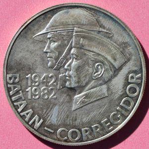 This fifty piso was struck by the Franklin Mint to honor the fiftieth anniversary of the fall of Bataan to the Japanese. It was hoarded and is common today altho many have PVC damage. This, and the accompanying gold 1500 piso (KM 237), are the last coins struck for the Philippines by the Franklin Mint. The Filipino soldier in the foreground looks suspiciously like Ferdinand Marcos, whose war record was exaggerated and obfuscated.