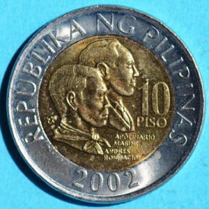 This ten piso was introduced in 2000 and struck until 2017. It is the second issue of this denomination, the first being the People Power commemorative of 1988 (KM 250). The obverse portraits are of Mabini and Bonifacio, two heroes of the struggle against the Spanish.