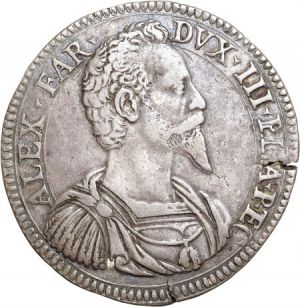 This specimen was lot 30805 in Heritage sale 3029 (New York, January 2014), where it sold for $1,292.50. The catalog description[1] noted, "Piacenza. Alessandro Farnese Scudo 1592-V R, VF35 NGC. A boldly struck example, evenly circulated, and with little apparent weakness. The toning is uniform and there is a small flan crack at 3:00. In addition to his position as Duke of Parma and Piacenza, Alessandro was also the governor of the Spanish Netherlands owing to his mother's illegitimate descent from the Emperor Charles V." The duchy of Piacenza was united with the duchy of Parma in the eighteenth century.