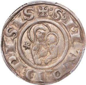 This specimen was lot 46870 in Stack's Bowers ANA sale (Chicago, August 2024), where it did not sell. The catalog description[1] noted, "ITALY. Pisa. Grosso, ND (ca. 1220-50). Pisa Mint. PCGS MS-62. In the name of Holy Roman Emperor Frederick I. Obverse: Half-length bust of Madonna facing slightly right, holding Holy Infant; star to left; Reverse: Large F (for Frederick) between four rosettes. Fairly well struck and attractively toned, this minor stands as an elite representative of the type." The republic of Pisa was an economic power in the Middle Ages but declined after suffering defeats at the hands of Genoa and was conquered by Florence in 1406. Always restive, she took the opportunity of the invasion of Italy by Charles VIII of France to rebel against Florentine control. Many battles, sieges and massacres later, she was incorporated into the Grand Duchy of Tuscany and resumed her life as a sleepy university town.