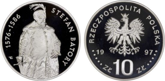 This specimen was lot 1134 in Steve Album Auction 51 (Santa Rosa, CA, January 2025), where it sold for $204. The catalog description[1] noted, "POLAND: Republic, AR 10 zlotych, 1997, Stefan Batory, Choice Proof." This is one of many ten złotych NCLT's struck in 1997. In 1995, the coinage was reformed, with one new złoty = 10,000 old złotych. Stephen Báthory (1533-84) was prince of Transylvania and king of Poland-Lithuania 1576-86.