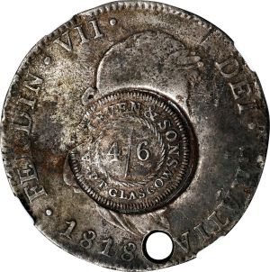 "SCOTLAND. Scotland - Mexico. Renfrewshire. Port Glasgow. 4 Shilling 6 Pence, ND (ca. 1820's). NGC VF Details--Holed. Issued by Alexander Steven & Sons, Port Glasgow. Countermark: 4/6 within corded border surrounded by: "A. Steven & Sons. PT Glasgow" applied to the obverse of an 1818-Mo JJ Mexico Bust 8 Reales of Ferdinand VII. An EXTREMELY RARE issuer with only seven recorded examples in Manville, most of which are permanently impounded in institutional collections, making this survivor a newly discovered eighth specimen. The countermark is deeply applied, though slightly cockeyed, on a moderately worn host. The surfaces are relatively smooth displaying rich mottled patina with minor earthen deposits amongst the devices. A hole after the date accounts for the details designation adding a bit of character to this seldom encountered issuer. Despite its shortcomings a presentable example that is sure to excite even the most advanced of collectors."