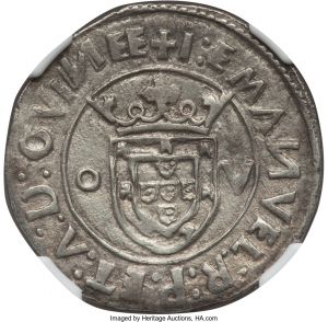 This specimen was lot 33624 in Heritage sale 3064 (Chicago, April 2018), where it sold for $456. The catalog description[1] noted, "Manuel I Tostao ND (1495-1521) AU58 NGC, Lisbon mint. A rather choice example of the type and the nicest that we have handled, with well-centered and boldly-struck details surrounded by argent-gray surfaces. Very-collectible at this level of preservation." Like many early Portuguese coins, this specimen is not dated, and can only be attributed to ruler.
