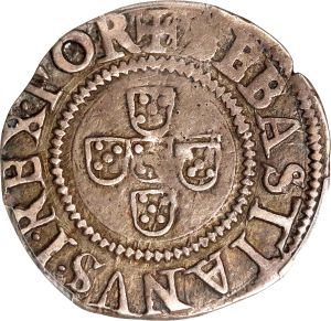 This specimen was lot 74454 in Stack's Bowers Collector's Choice sale (Costa Mesa, CA, February 2023), where it sold for $144. The catalog description[1] noted, "PORTUGAL. 1/2 Tostao (50 Reis), ND (1557-78). Lisbon Mint. Sebastiao I. PCGS EF-40. A lovely hammered piece with clean surfaces toned to a pleasing deep gray color. With strong well-centered detail and comparatively limited areas of weak strike, this coin is a better than usual representative of the type." In 1578, king Sebastian of Portugal was killed fighting the Moors in Africa. After some confusion, in 1580, Philip II moved in and annexed the country, which was held as part of the Spanish crown until 1640.