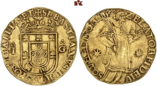Sebastian's death in North Africa while fighting the Moors ended the Aviz dynasty. After some confusion, Philip II moved in and annexed Portugal to Spain, where it would remain until 1640. This type is rare; a very rare variety (Fr-36) shows arrows on either side of the shield. Others were struck at the Porto mint (Fr-37) and a half são vicente exists (Fr-38).