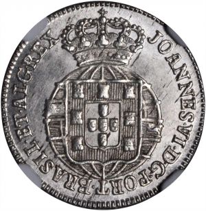 This specimen was lot 24690 in Stack's Bowers NYINC sale (New York, January 2018), where it sold for $228. The catalog description[1] noted, "PORTUGAL. 60 Reis, ND (1816-26). NGC MS-66. A sparkling little gem. Sharply struck with soft satin luster and highly attractive." For some reason, Portugal struck the smaller silver denominations without dates. This sixty réis (3 vinténs) was accompanied by copper forty réis (pataco), silver fifty réis (half tostão), eighty réis (tostão) and 120 réis (6 vinténs, KM 353). The practice did not end until the decimal reform of 1837. The larger silver coins were dated.