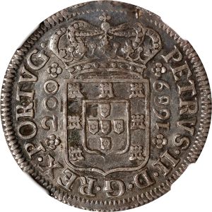 This specimen was lot 43250 in Stack's Bowers NYINC sale (New York, January 2023), where it sold for $336. The catalog description[1] noted, "PORTUGAL. 200 Reis, 1689-P. Porto Mint. Pedro II. NGC AU-55." This type was struck 1688-1690 at Porto during the reign of king Peter II (1683-1706). This denomination was also struck 1686-97, 1701-06 at Lisbon with rosettes instead of the "P's" shown here. Surprising, despite the many years of issue, the Lisbon product is priced higher than the Porto issue. It is one of the earliest machine-struck coins of Portugal, which commenced using the screw press about 1677.