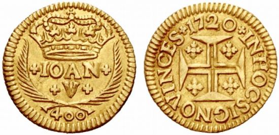 This specimen was lot 3061 in UBS sale 76 (Basel, Switzerland). This type is catalogued in the SCWC as a cruzado novo, worth 400 or 480 réis, depending on which side of the devaluation you stand. It was struck in Lisbon 1718-48 and all dates are much scarcer than the catalog indicates.