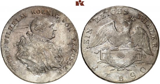 "BRANDENBURG-PREUSSEN, PREUSSEN, KÖNIGREICH, Friedrich Wilhelm II. 1786-1797. Reichstaler preuß. 1790, B, Breslau. Sehr schön. (Germany, kingdom of Prussia, Frederick William II, 1786-97, thaler of 1790, Breslau mint. Very fine.)"