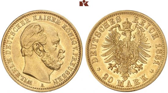 "BRANDENBURG-PREUSSEN, PREUSSEN, KÖNIGREICH, Wilhelm I. 1861-1888. 20 Mark 1877, 1881, A. 2 Stück., Sehr schön-vorzüglich. Erworben am 24.7.1967. (Germany, kingdom of Prussia, William I, 1861-88, twenty mark of 1881. [One of] two pieces, very fine to extremely fine.)"