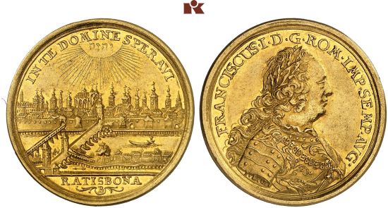 On the occasion of the coronation of Francis I as emperor, Regensburg, which had supported his rival Charles VII, struck a long series of gold coins, from ten ducats down to 1/32 ducat (Fr-2520 to -2547). To the confusion of collectors since, none are dated; some were likely struck years later. Another double ducat exists from this period struck from single ducat dies (KM 330/Fr-2537).