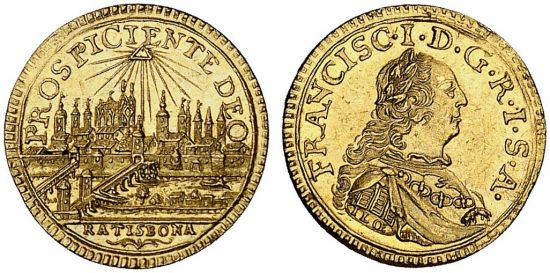 This quarter ducat was minted in the free city of Regensburg sometime before 1750 in conjunction with half, one, two, 3, 4, 5 and 6 ducats. It was probably minted to apologize to Francis I for supporting his rival Karl VII in the War of the Austrian Succession.