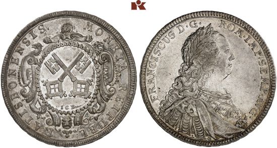 This half thaler is attributed in the SCWC to 1742, which seems unlikely, as Regensburg was then striking coins for Francis's rival, Charles VII of Bavaria.