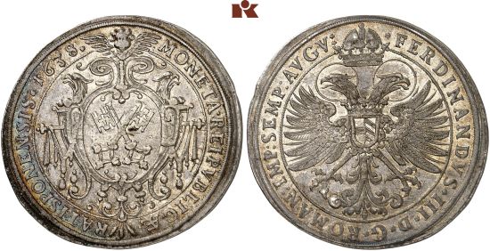 "DIE REICHSSTADT REGENSBURG. DIE ZEIT DES KAISERS FERDINAND III. Reichstaler 1638, mit Titel Ferdinands III. Münzmeister Johann Putzer. RR Attraktives Exemplar mit feiner Patina, winz. Schrötlingsfehler, vorzüglich. Exemplar der Slg. Julius Jenke, Auktion Beckenbauer 1, München 1961, Nr. 54. (city of Regensburg, thaler of 1638, in the name of Ferdinand III. Very rare, attractive example with fine patina, small planchet defects, extremely fine.)"