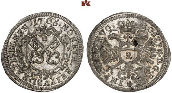 "DIE REICHSSTADT REGENSBURG. DIE ZEIT DES KAISERS JOSEFS I. 2 Kreuzer (1/2 Batzen) 1706, mit Titel Josefs I. Münzmeister Johann Michael Federer. Stempelschneider Johann Pichler. Vorzüglich-Stempelglanz. (city of Regensburg, two kreuzer or half batzen of 1706, struck in the name of Joseph I. Extremely fine to uncirculated.)"