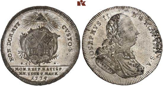 "DIE REICHSSTADT REGENSBURG. DIE ZEIT DES KAISERS JOSEF II., 1765-1790. Kurant- und Scheidemünzen aus der Zeit des Kaisers Josef II. ½ Konv.-Taler 1774, mit Titel Josefs II. Münzmeister Georg Christoph Busch. Stempel­schneider Johann Nikolaus Körnlein. Mit großem Kopf. Prachtexemplar. Feine Patina, leicht justiert, vorzüglich-Stempelglanz. (city of Regensburg, convention half thaler of 1773, struck in the name of Joseph II, with large head. Cabinet example, lightly adjusted, extremely fine to uncirculated.)"