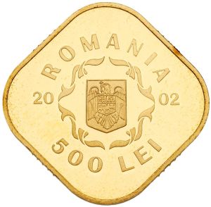 This specimen was part of lot 1257 in Goldberg's NY International sale 58 (New York, January 2023), where it sold for $2,760. The catalog description[1] noted, "Romania-Republic. Three-piece Set of Gold 500 Lei, 2002 total weight 18.66 g. Christian Feudal Art Monuments series. View of the Mogosoaia Palace, Bistrita Monastery and Coltea Church. Rev. Arms within ribbon scroll cartouche (KM 174-176) 250 sets were minted. In original case. Brilliant Uncirculated." The post-communist regime in Romania has taken to issuing NCLT's honoring bizarre events and anniversaries. This one honors a historic monastery, a more conventional topic. Another gold 500 lei (KM 175) honored a palace while KM 145 was struck in aluminum for circulation.