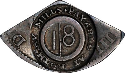 "SCOTLAND. Scotland - Mexico. Bute. Rothsay. 1 Shilling 8 Pence (2 pieces), ND (ca. Early-19th Century). PCGS VF-20 Gold Shield; Countermark: EF Details. Countermark: 1/8 surrounded by: 'Payable at Rothsay Mills✦' applied to a (178)2 1/3 cut Bust 8 Reales presumably from the Mexico City Mint of Charles III. VERY RARE in this state of preservation with a neat Mid-19th Century provenance. Countermark boldly applied with good definition of the details. An attractive example that displays lovely old cabinet patina. One of the nicest examples we have seen of this issue. The lot also includes a copy of Boyne's Silver Tokens, published London 1866. From the Kyle Ponterio Collection. Ex: Classical Numismatic Group Triton XIX January 5, 2016 Lot # 680 (with lot tag). Ex: Bank Leu Auction # 51 October 24-25, 1990 Lot # 680 "A Bostonian Collection" (with lot tag). Ex: Glendining's Auction November 24, 1954 Lot # 260."