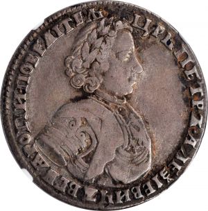 This specimen was lot 20467 in Stack's Bowers NYINC sale (Newport Beach, CA, January 2021), where it sold for $1,920. The catalog description[1] noted, "RUSSIA. Poltina (1/2 Ruble), 1706 (in old Cyrillic). Red (Moscow) Mint. Peter I (the Great). NGC VF-25. This very attractive and wholesome representative of the type from this popular Czar exhibits even wear displaying lovely mottled gray patina highlighted by areas of richer coloration amongst the devices and peripheries adding to its originality and pleasing appearance." This half ruble of 1706 is rare, like most of the silver minors of Peter I.