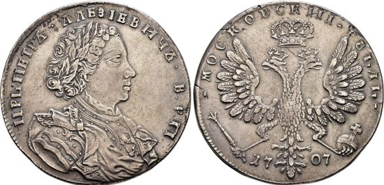 "RUSSLAND Kaiserreich und Föderation, Peter I. 1682-1725, Rouble 1707, Kadashevsky Mint. Portrait by G. Haupt without mint master initials, without ribbon on wreath. Selten, Gutes sehr schön, Leicht gereinigt, Rare. 10 roubles according to Petrov. Good Very Fine. Lightly cleaned. From auction Classical Numismatic Group 111, May 2019, lot 988. From the RAJ Collection, Stephen Harvey FPL (August), lot 471."