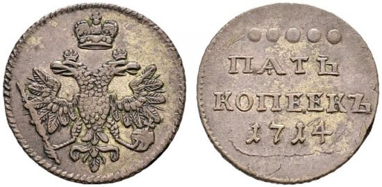 This specimen was lot 67 in Sincona sale 19 (Zürich, October 2014), where it sold for CHF 28,000 (about US$35,089 including buyer's fees). The catalog description[1]Shiryakov noted, "5 Kopecks 1714, Red Mint. Very rare. 30 roubles according to Petrov!! Minor planchet defects. About extremely fine." This billon five kopeks of 1713-14 is mentioned but not priced in the SCWC. The five kopeks in copper and in silver was a workhorse denomination and was struck in large numbers from multiple mints, especially after 1758.