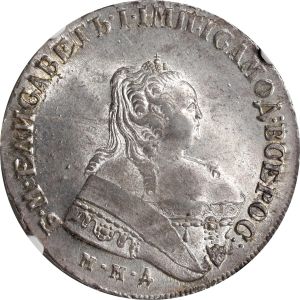 This specimen was lot 1535 in Stack's Bowers NYINC sale (New York, January 2022), where it sold for $6,600. The catalog description[1] noted, "RUSSIA. Ruble, 1749-MMA. Moscow Mint. Elizabeth. NGC MS-63. Wonderous with a sheening luster, this attractive example yields boastful details and some subtle gold tone on the peripheries. Well-struck with an easily identifiable strike-through that runs from Elizabeth's head to the legend around 9 o'clock, this choice Ruble is tied for the finest certified by NGC, and certainly is one the most aesthetically pleasing examples extant. A must have for the collector of Rubles seeking a premium piece for their collection." This type was issued from St. Petersburg and Moscow (shown here) 1742-51 and is fairly common tho not cheap.