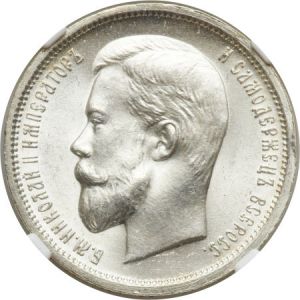 This specimen was lot 28896 in Heritage sale 3022 (New York, January 2013), where it sold for $2,232.50. The catalog description[1] noted, "Nicholas II 50 Kopecks 1912 ЭБ, MS65 NGC, a fully lustrous gem, and deserving of a strong bid." This is the most common date of a type struck 1895-1914. The fifty kopeks replaced the old poltina or half ruble.